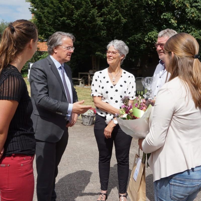 De beleefboerderij Van ’t Zandeind in Riel was de laatste stop. De familie Huijbregts vertelde hier vol passie over hun activiteiten. Over de zorgboerderij, de camping, de winkel en andere (dag) activiteiten. Maar ook hoe het geworden is tot wat het nu is en waar de familie tegenaan loopt. Zoals bijvoorbeeld de balans tussen het geven van zorg en het invullen van formulieren. Van de Donk vond het mooi om de passie te zien en de combinatie van zorg voor mens en dier op een locatie waar je de geschiedenis voelt. Dit bezoek werd afgesloten met de woorden van de commissaris: ‘Van dit bezoek heb ik veel geleerd en dat neem ik mee naar het provinciehuis. Een inspirerend bezoek’.